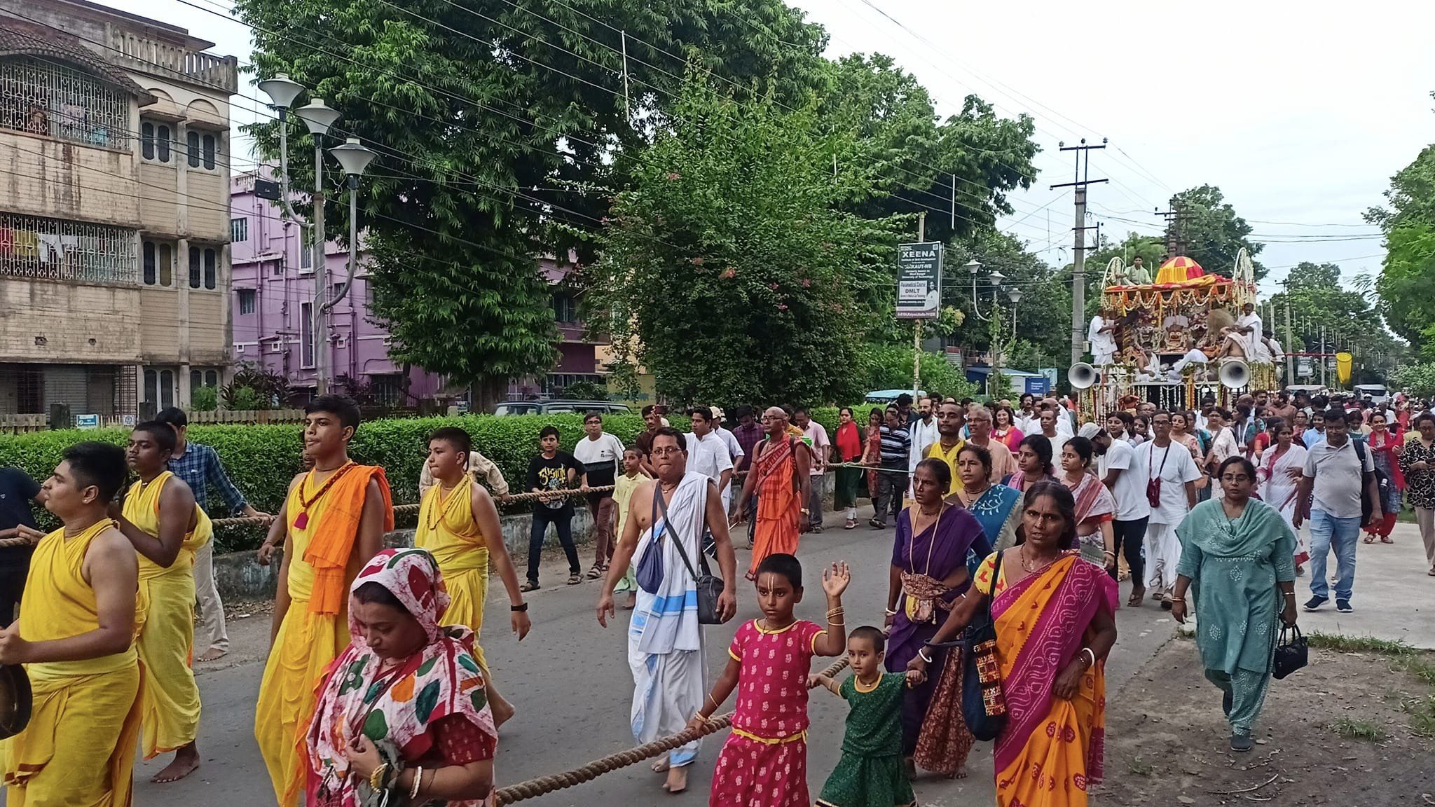 ISKCON Kalyani hosts an annual Ratha Yatra festival, where Lord Jagannath, Baladeva, and Subhadra are taken on a grand procession in decorated chariots. Devotees pull the chariots through the streets, chanting and dancing with joy, inviting everyone to join in this joyous celebration.